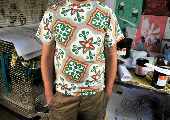Quello del creativo è un mestiere difficile, l’arte in generale è un settore dove è difficoltoso emergere e distinguersi, se a questo si aggunge un laboratorio di serigrafia che a quanto pare è “messo peggio d’italia”, così lo descrive Angelo Milano, ideatore del nenonato marchio Sangue, riuscire a produrre una linea di rilievo è un’impresa non da poco. Sangue è un marchio prodotto in Puglia, in particolare fra le mura di Studio Cromie, nella città di Grottaglie dove, attraverso un bizzarro sistema di stampa (a mano) su tessuto, vengono prodotti capi fra cui t-shirt, felpe e costumi da bagno. A colpirmi in particolare è la stamnpa che richiama la pavimentazione tipica di alcune vecchie case.