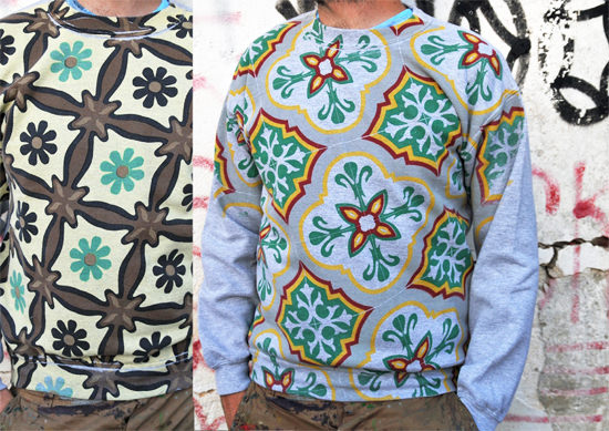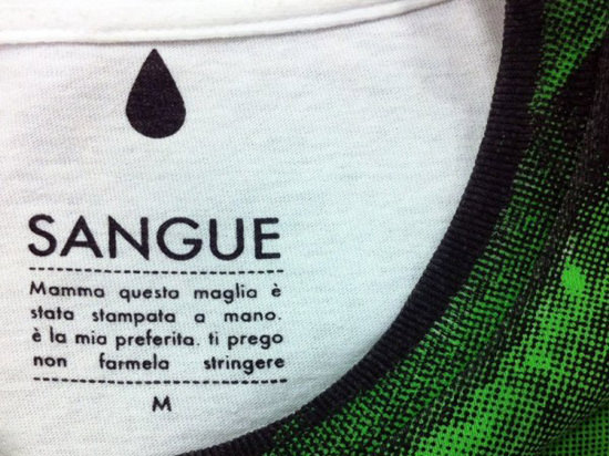 Quello del creativo è un mestiere difficile, l’arte in generale è un settore dove è difficoltoso emergere e distinguersi, se a questo si aggunge un laboratorio di serigrafia che a quanto pare è “messo peggio d’italia”, così lo descrive Angelo Milano, ideatore del nenonato marchio Sangue, riuscire a produrre una linea di rilievo è un’impresa non da poco. Sangue è un marchio prodotto in Puglia, in particolare fra le mura di Studio Cromie, nella città di Grottaglie dove, attraverso un bizzarro sistema di stampa (a mano) su tessuto, vengono prodotti capi fra cui t-shirt, felpe e costumi da bagno. A colpirmi in particolare è la stamnpa che richiama la pavimentazione tipica di alcune vecchie case.