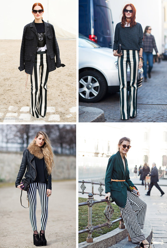 A sfoggiarli utlimamente sono stati cool hunter, giornalisti e non solo, che li hanno combinati con blazer, maglioni e giacche in pelle, scongiurando l’effetto circense e giocando con il potere snellente delle righe che, su gambe magre e slanciate, esaltano la silhouette. A proporli in chiave low cost ci ha già pensato Zara (prezzo 29,95€). Il rischio di questa tendenza? vedere ororri a strisce circolare in città, c’è da augurarsi che chi vorrà sposare il trend lo faccia con cura.
