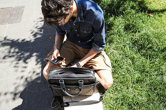 Se sbirciando nel contenuto della borsa di una donna è possibile capirne la personalità, curiosando in quella di uomo non si fa eccezione, per questo quando lui tira fuori la roba dalla sua, per riorganizzarla per il giorno successivo, mi scopro affascinata da ciò che contiene, che si tratti della versione cinese di Pinocchio, di una cover per iPhone che fa il verso alle vecchie music cassette o del primo romanzo di Game of Thrones.
