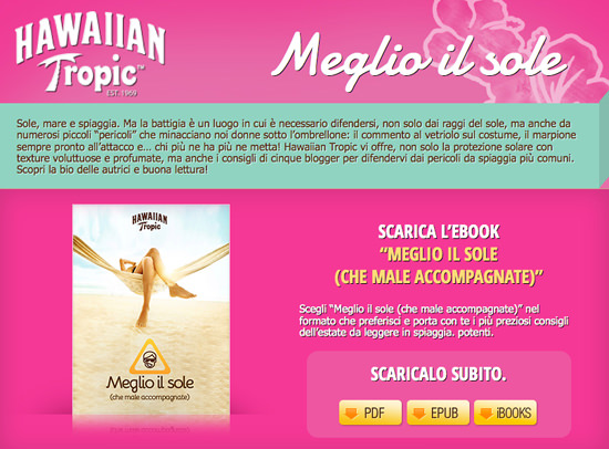 Potete leggere questi cinque racconti, che attraversano l’Italia da Nord a Sud e viceversa, scaricando l’ebook gratuitamente QUI, disponibile in versione PDF, ePub e iBooks, per sfogliarlo attraverso il vostro computer, ebook reader, iPad o iPhone sorridere magari guardandosi intorno, riconocendo i tipi da spiaggia da cui difendersi, per tutto il resto (il solke) ci pensa Hawaiian Tropic. Io mi sono divertita a scriverlo, spero anche voi a leggerlo.