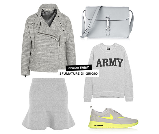 Comunque la vogliate mettere, il grigio è sicuramente il passepartout della stagione invernale, basato sull’unione di nero e bianco in parti uguali (per questo ritenuto un colore sinonimo di equilibrio fra bene e male), prende il meglio di questi due colori, con i quali si abbina perfettamente, trasformandosi nella nuance ideale per l’inverno: non troppo cupo nè troppo chiaro, decisamente chic ed elegante, ideale su cappotti, maglioni, sciarpe, guanti, borse, scarpe… In foto (sopra) giacca J Brand, felpa NLST, gonna J.Crew, borsa Gucci, scarpe Nike Air Max. In foto (sotto) laptop case, cover iPhone, vaso e palla di Natale Pantone (scopri QUI le tendenze colore del 2015 secondo Pantone). Da oggi in poi se acquistate qualcosa di grigio pensate che state facendo involontariamente una scelta non solo in fatto di moda e che state indossando il colore di chi da solo si completa e tutto il resto è solo un plus favolos della vita.