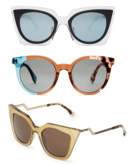 In casa Fendi le geometrie sono protagoniste, insieme a nomi di montature che varrebbe la pena scegliere anche solo in base al suono. Orchidea, modello cat-eye in acetato trasparente e profili squadrati, con tagli geometrici irregolari (€ 380); By The Way, che celebra l’omonima borsa del marchio (€ 300) e Iridia, montatura squadrata impreziosita da dettagli Swarovski.