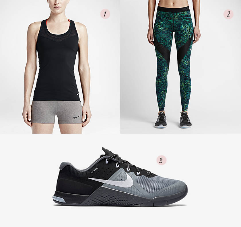 1. canotta nera Nike Pro Hypercoool, 2. leggings (credo i più belli mai indossati) modello Nike Pro Hypercool Tidal Multi. 3. Scarpe da training Nike Metcon 2.