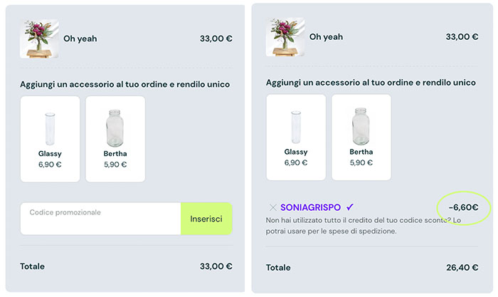 codice sconto SONIAGRISPO da inserire maiuscolo una volta messo il bouquet o altri prodotti nel carrello, vale il 20% di sconto su tutto.