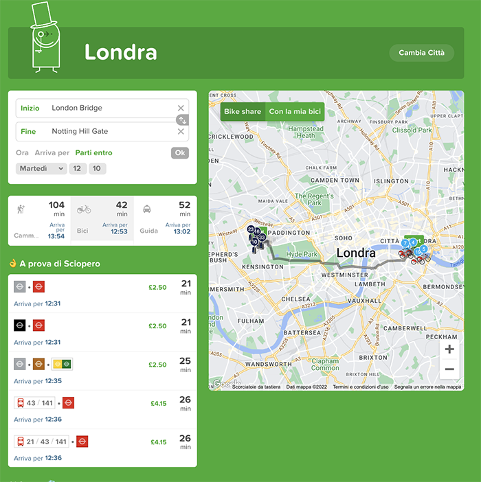Per camminare da un punto all’altro può essere comodissimo il solito Google Maps, ma per calcolare i tragitti con i mezzi ti consiglio CityMapper, che oltre a mostrare le varie opzioni di tragitto ti indica anche il costo, così puoi anche valutare qual è il mezzo più conveniente per te, nonché i mezzi con l’aria condizionata, quelli senza barriere architettoniche o info su eventuali scioperi…