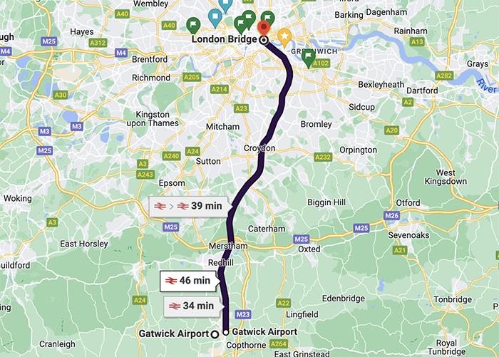 Gatwick non è servito dalla metro ma è collegato alla città attraverso Gatwick Express, Southern e Thameslink, il primo è abbastanza costoso (£37 a/r), gli altri due sono dei treni, l’ultimo nello specifico è quello ideale per London Bridge (30-40 minuti) e più economico del primo.