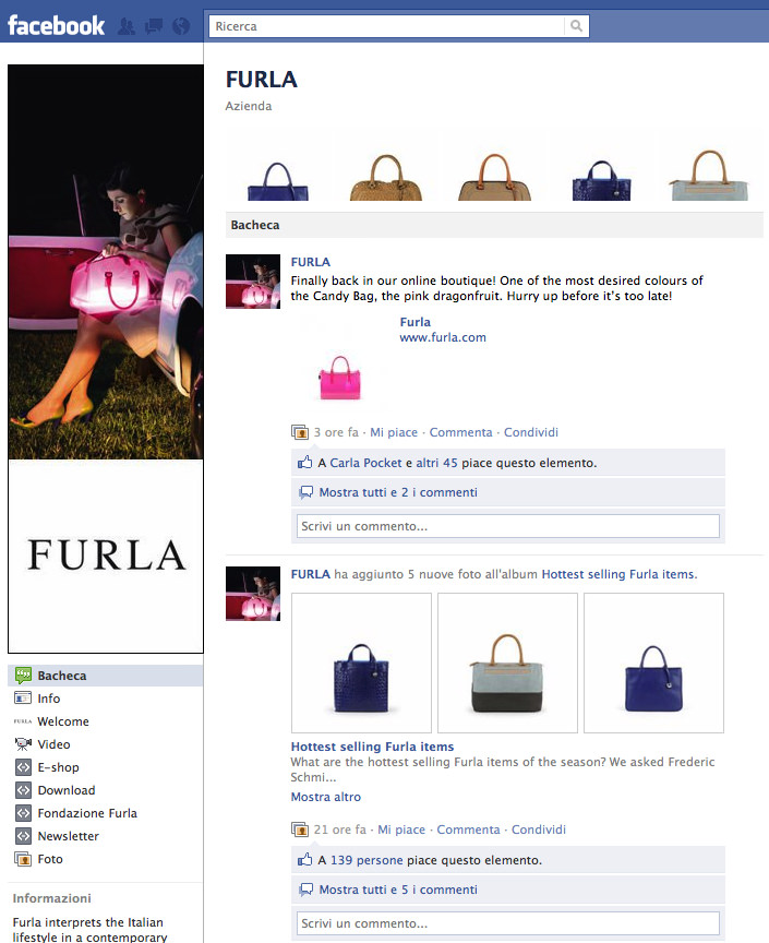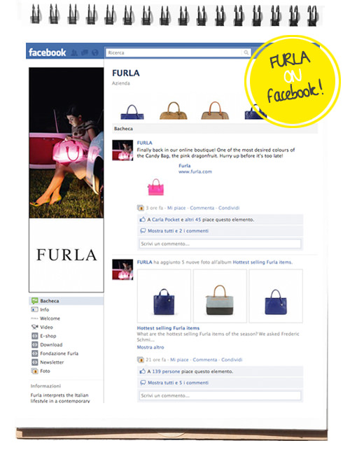 Anche nella quotidianità Furla ha deciso di farci compagnia, creando una pagina Facebook attiva che coinvolge i lettori, non più acquirenti passivi ma parte attiva di un dialogo partecipato. Su Facebook trovate le novità in anteprima, notizie in esclusiva e guest post di alcuni blogger, come nel caso della sottoscritta, ho selezionato le mie 5 borse preferite e le ho commentate con i fan della pagina… e la vostra borsa preferita del brand qual è? Se volete tenervi aggiornate sulle novità di Furla cliccate Mi Piace QUI.