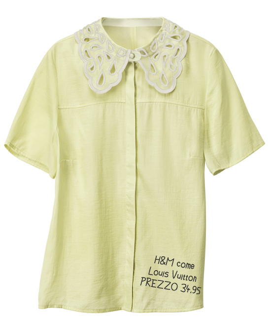 Che le catene low cost si ispirino alle passerelle è un dato di fatto, questa volta H&M ha preso un po’ troppo sul serio il concetto di ispirazione, proponendo nella sua collezione primaverile una camicia che ricorda non poco quella proposta da Louis Vuitton nella collezione primavera-estate 2012. Giallo paglierino e colletto bianco traforato, a richiamare i petali delle margherite. La somiglianza c’è eccome!
