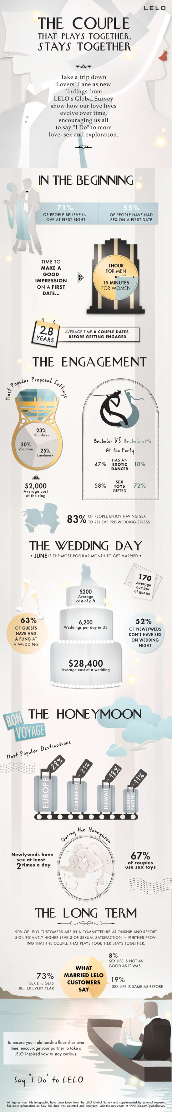 A risolvere il problema arriva Lelo, marchio di riferimento per sex toys e affini, che suggerisce una sfiziosa idea regalo per le giovani coppie di sposi ed evita che scadiate nel solito noioso regalo. Si tratta di LELO Bridal Pleasure Set, pensato per rendere più piccanti i momenti d’intimtà della coppia. Secondo le statistiche di Lelo infatti il 67% degli sposi utilizza un sex toy durante la luna di miele. Il costo è di 159 euro, ma dal 5 Giugno al 5 Luglio Lelo vi permette di provare a ricevere in regalo uno dei kit messi in palio ogni giorno per un mese, grazie al concorso su Pinterest (QUI tutte le info). Di seguito trovate l’infografica di Lelo dedicata i matrimoni e QUI un video che vale la pena di vedere.