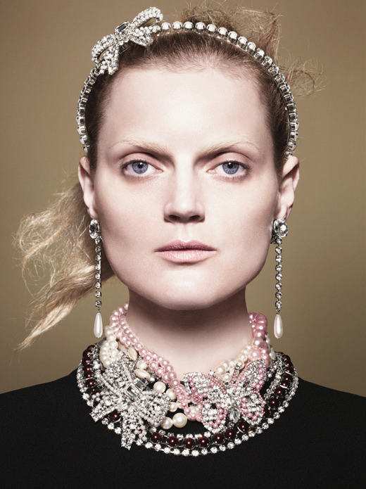 Difficile da interpretare la scelta di Miu Miu per la campagna Resort 2012. La protagonista è l’austera e androgina Guinevere Van Seenus, che personalmente non è fra le mie modelle preferite e non sono certa rappresenti lo spirito del brand, generalmente identificato in donne giovani, quasi adolescenti. Gli scatti sono opera di David Sims, il mood è aristocratico ed elegante, sottolineato da abiti trasparenti in pizzo intarsiato con colletti trompe-l’oeil, in cady armuré o in taffetas con manica e gonna a palloncino, resi preziosi da collier e orecchini in ottone con cristalli multicolor, collane e bracciali con cabochon in perla e fermaglio-gioiello.