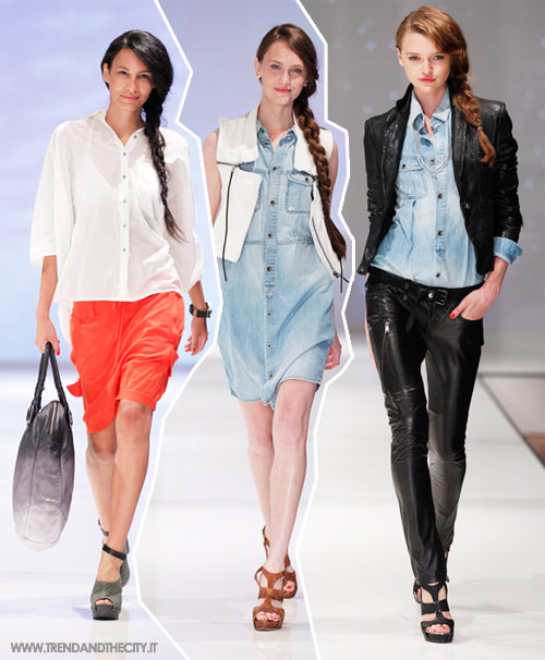 Chemisier in jeans, giubbotti in pelle, shorts con bretelle e dettaglio fluo colorano la passerella dell’estate 2011 di Diesel, al look rock si abbina una delicata treccia lunga e laterale che unisce un animo strong ad uno romantico, della serie i dettagli contano. Il fascino intramontabile della camicia di jeans è innegabile, è casual se abbinata ad un paio di ballerine, sportiva se indossata con jeans e sneakers e rock se abbinata a giubbotto in pelle e liquid leggin, non per niente è un capo da possedere assolutamente.
