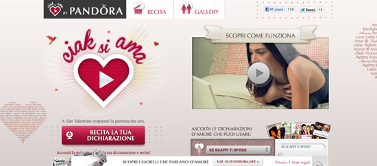 Il noto marchio di gioielli ha ideato il sito Ciak si ama, in cui ogni utente, già dall’1 Febbraio, può scegliere una delle dichiarazioni d’amore fra le più celebri del mondo del cinema, da reinterpretare e dedicare al proprio innamorato o alla propria innamorata. Insomma un modo tutto originale e ironico per dire “ti amo” a San Valentino (ma non solo) utilizzando le parole di un attore o attrice famosa, approfittando della loro capacità di avere sempre la battuta pronta per far tremare le gambe. Bastano una webcam e un minuto di tempo per recitare le battute che, come a teatro, scorrono sul gobbo e inviare le dichiarazioni d’amore della romantica Carrie di Sex and the City o la goffa Bridget Jones, per lui, mentre per le dichiarazioni rivolte alle donne sarà possibile rubare le battute di Ben Affleck tratte da La verità è che non gli piaci abbastanza o di Hugh Grant in Quattro matrimoni e un funerale. Ovviamente è possibile cancellare e registrare nuovamente il filmato fino ad ottenere un video perfetto da inviare al proprio innamorato e condividere su Facebook.