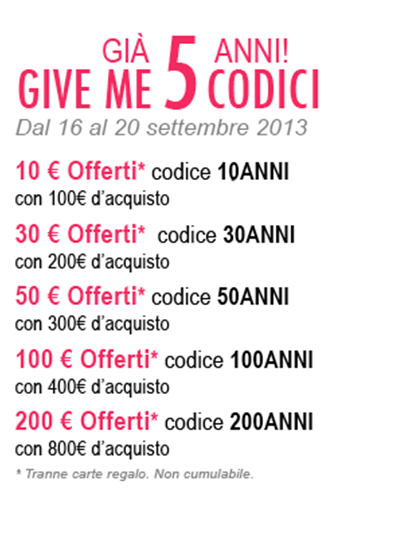 « Give me 5 codici ». Dal 16 al 20 settembre, 5 codici di riduzione da usare per i vostri acquisti.