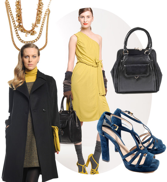 Nel collage in alto trovate alcuni capi in vendita da Diffusione Tessile: Abito UBICATO, Borsa AUSPICIO, Cappotto 3CICALA, Scarpe ALISCAFO e Collana MEDEA.