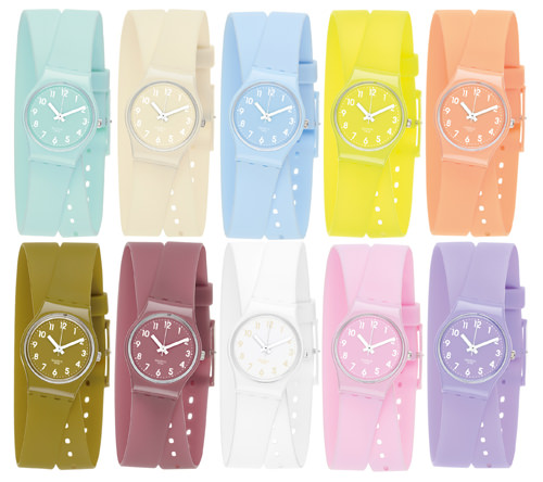 Si propone come l’rologio della prossima stagione, l’accessorio cheap ma chic della primavera/estate 2011: Swatch con la sua nuova collezione The Lady Collection si rivolge al pubblico femminile con dieci nuove colorazioni ed un modello sempre più glamour. Il cinturino in silicone avvolge il polso due volte ed è declinato nei toni dell’arancio melone, giallo limone, bianco, rosa baby, viola, verde militare, azzurro, prugna, cream ed un bellissimo azzurro Tiffany denominato artic sea.